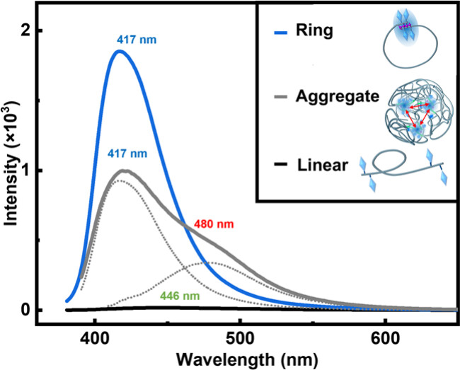 Intramolecular closure is an effective method to derive polymer rings in which the ends of the parent polymer chains are strongly connected. It is important to develop simple and sensitive methods to discriminate between the intramolecular ring closure and intermolecular cross-linking. Herein, we propose the aggregation-induced emission (AIE) based method to monitor the intramolecular closure of polymer chains. The example polymer of poly(pentafluorophenyl methacrylate)-block-poly(2-(dimethylamino) ethyl methacrylate)-block-poly(pentafluorophenyl methacrylate) (PPFPMA-b-PDMAEMA-b-PPFPMA) is synthesized by RAFT polymerization, and the AIEgens and reactive styryl groups are grafted at the end blocks by reactions with 1-(4-aminophenyl)-1,2,2-triphenylethene and 4-vinylaniline. Along with the electrostatics-mediated intramolecular closure at the dynamic single-chain nanoparticle (SCNP) via ultraviolet (UV)-irradiated radical reaction toward the polymer rings, the AIEgens become highly restricted at the individual cross-linked cluster, giving a rather bright, spectrally narrow emission at 417 nm. In contrast, multiclusters are present at the intermolecularly cross-linked aggregate which are strongly coupled giving an additional red-shifted emission at 480 nm. The resulting AIEgen-functionalized polymer rings therefore combine sharply defined fluorescence signatures with enhanced stability in poor solvents, offering promise as functional optical materials and potential diagnostic probes.